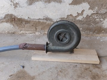 Figure 9: The blower, the burning furnance and Alex adjusting the system on April 21.